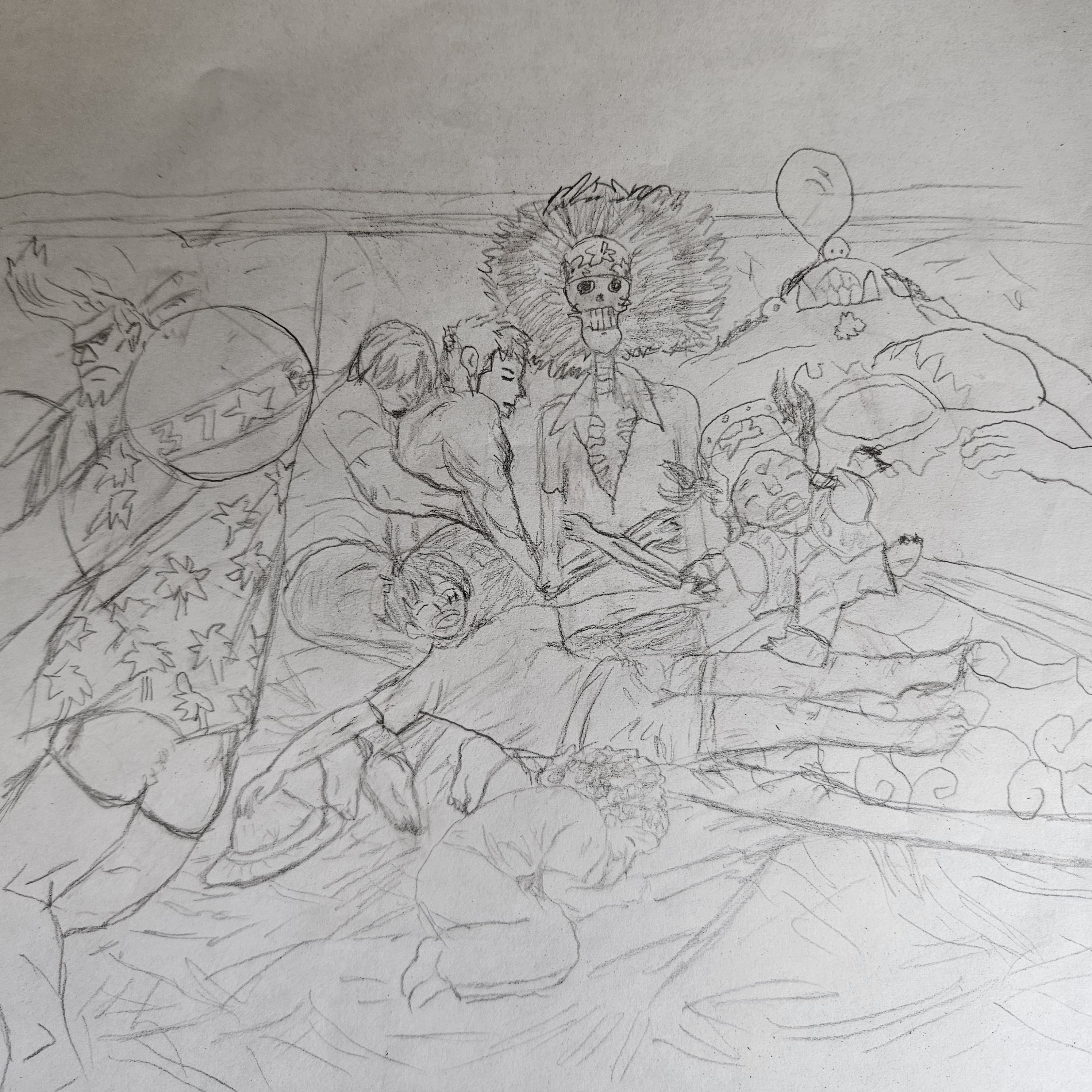 Chopper – who’d been waiting patiently – joined them, climbing up onto Jinbe’s wide chest, to use him for a pillow. Luffy sprawled across their legs. Usopp curled into a defeated ball beneath Sanji and Zoro’s tucked feet at the end of the bed.